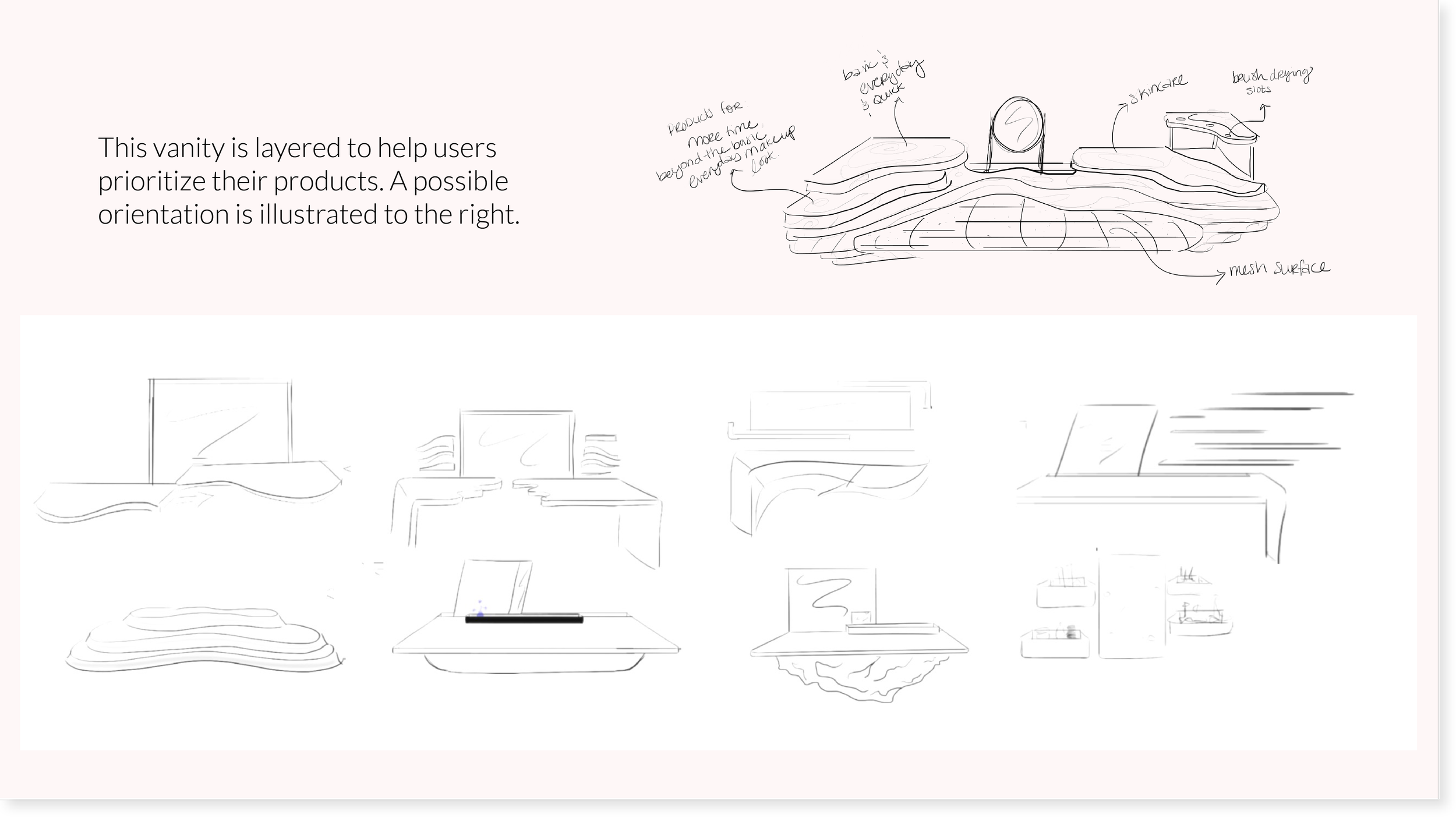 Avela: a flexible make-up vanity optimized for efficiency and functionality featuring brush holders, product tiers, illuminated mirror, and cellphone holder